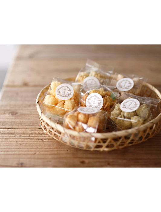 もち米(石川県白山市産)、食用こめ油、ヨモギ(国産)、紫蘇(石川県産)、青のり(国内製造)、カレー粉、塩(能登製造)
