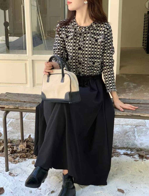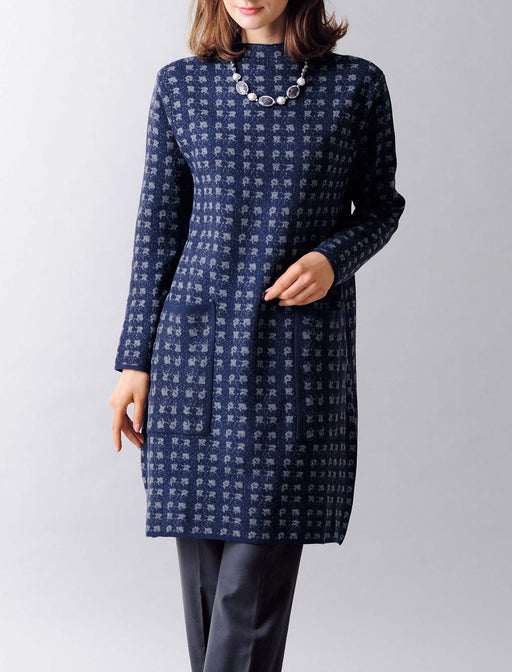 チェック柄をモチーフにした「ジャカード織りニット」で作ったワンピース。 これ一枚でもブルゾンを羽織ってもお洒落に決まる。 ちょっとお出かけの時も左右のポケットが便利◎