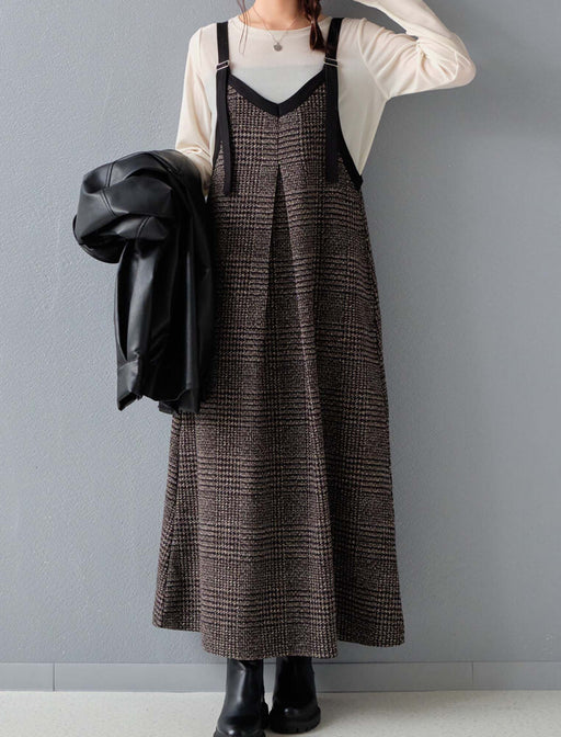 ストリングデザインの配色パイピングがポイントのロングワンピース。 クラシカルな印象のグレンチェック柄を採用し、肩紐はアジャスター付きなので身長に合わせて調整可能。 前後2WAYでお使いいただけるのでスタイリングの幅も広がります。 程よくゆとりのあるデザインにロングレングスな着丈が大人っぽく女性...