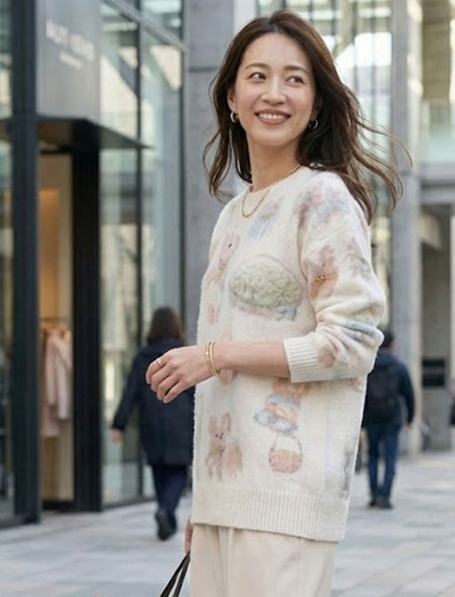 愛らしいうさぎモチーフと、パステルカラーの総柄が目を引く主役級ニット。 思わず触れたくなるような、ふわふわと柔らかな質感が女性らしさを演出します。 お出かけが楽しくなる、遊び心たっぷりの一着です。