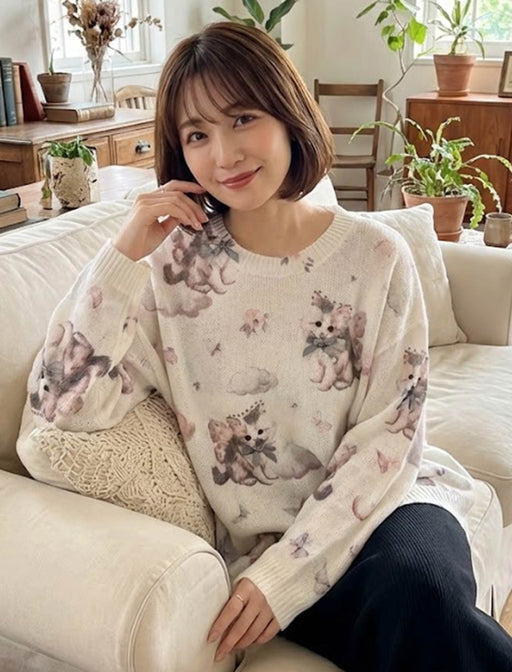 淡いパステルカラーで描かれた子猫と花々が、幻想的なムードを演出。 マシュマロのような柔らかい肌触りで、身に纏うだけで心がほどける一枚です。 冬のガーリースタイルを、より愛らしく、より暖かく彩ります。