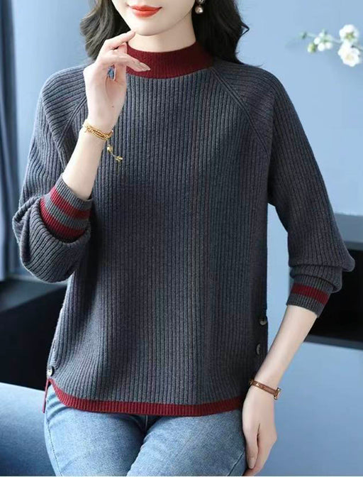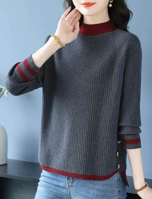 襟元と袖口の配色がお顔周りを引き締め、若々しい印象に。 細めのリブ編みと程よいゆとりが、体のラインを拾わずスッキリ見せます。 裾の飾りボタンが遊び心を添える洗練されたデザインです。