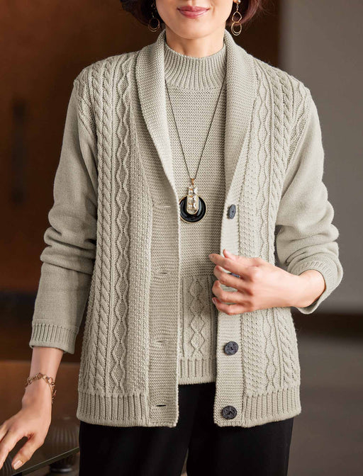 「あたたかみのある国産ウール100%ニット」 ケーブル編みが印象的なショールカラーのニットジャケット。 インナーに合わせたハイネックのセーターともに上質なウール100%使用。 セーターの前身頃はガーター編みとケーブル編みの切り替えデザインで、一枚での着映え力も十分です。