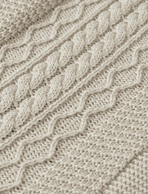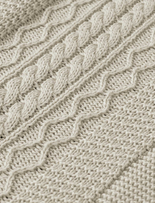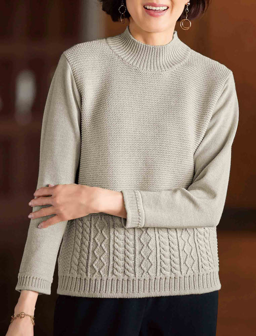 襟元や裾の白が映える、1枚で理想の重ね着が叶うニット。 豊かなケーブル編みが縦ラインを強調し、重ね着特有の着ぶくれを防いでスッキリ見せます。 お顔周りを明るく彩る白が、大人の品格を漂わせる贅沢な一着です。
