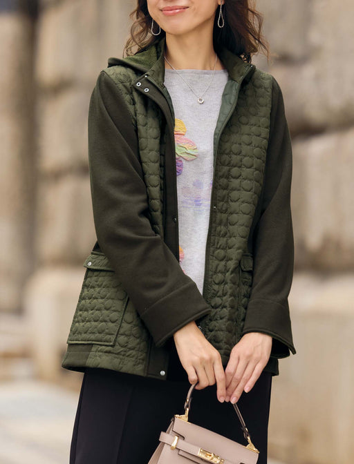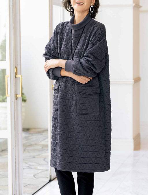 フロントのキルト切替えが、着膨れしがちな冬の装いをスマートに演出。 カットソー素材をベースにしているから、驚くほど軽く、肩こり知らずの着心地で。 家事の合間の外出から、冬のお散歩まで。あなたの日常に、一番近い温もりを届けます。