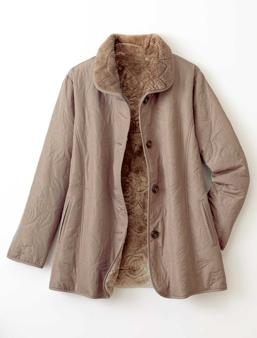 衿と身頃、袖口裏のボア使いがふんわり暖かく着心地のよいジャケットです。 どこか懐かしく、それでいて洗練されたボタニカル柄は、重くなりがちな冬のコーディネートをパッと明るく彩ります。 サッと羽織るだけで「きちんと感」と「最高の暖かさ」が手に入る、冬の頼れるパートナーです。