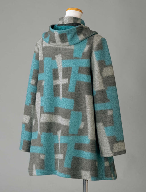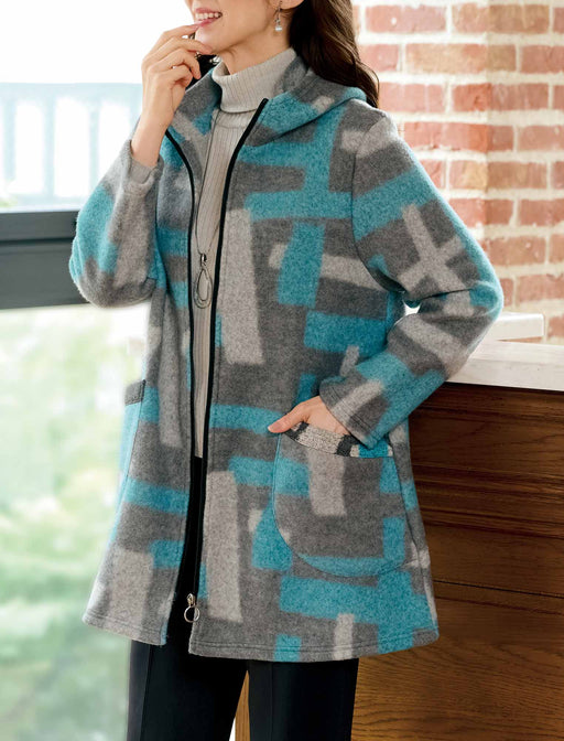 ライトな着心地と色合いでふだんにもお出かけにも活躍。 見た目も着心地もあたたかなふんわりとした起毛素材のコート。 配色のブロック柄が冬の着こなしを明るく見せてくれます。 フード風の大きめ衿もポイント。