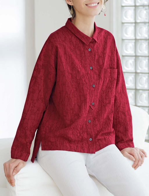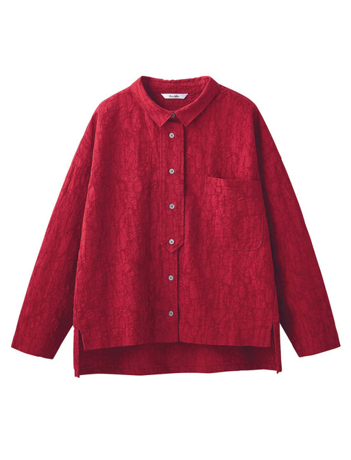 顔色まで美しく映すジャカード織と深い赤。 表情を明るく見せてくれる美しい色と、立体的に浮き立つジャカードの織り柄がエレガント。 タブを効かせた前立てもおしゃれなシャツは、合わせるボトムスを選ばず、装いに華やぎをまとわせます。