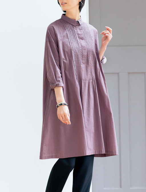 広がるAラインをモードな彩りと端正なディテールで上品に。 裾へ向かってたっぷり広がるAラインのワンピースを、ほんのりモードなニュアンスカラーで大人っぽく。 長めに入れたピンタックと襟付きデザインで上品に仕上げました。