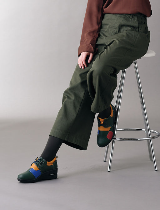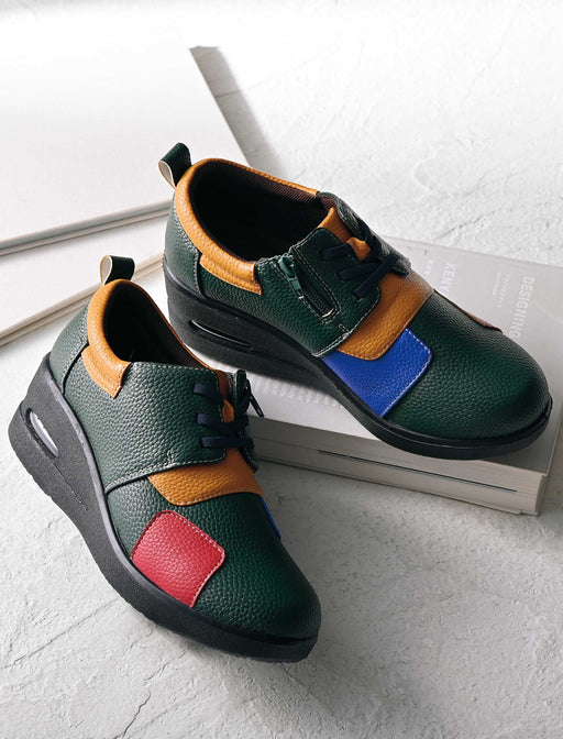 カラフルなパッチワークデザインが ユニークな「エアソールウォーキングシューズ」 ゴム紐とサイドファスナーで脱ぎ履きしやすく、クッションインソールが足に優しい。 こだわり派のあなたに贈る、機能美と意匠性が融合した特別な一足です。