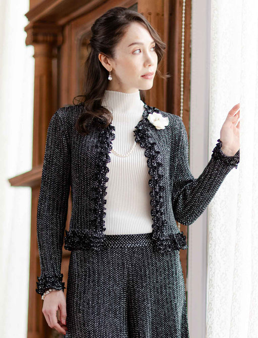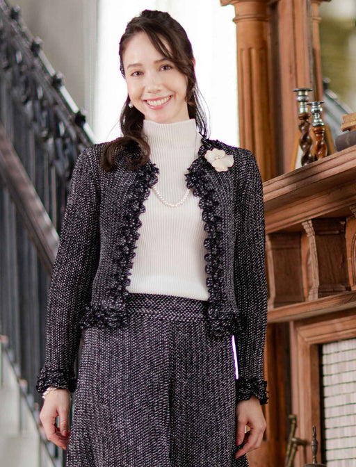 エレガントな印象に大人っぽく仕上げたノーカーラーのティアードフリルジャケット。 形はキレイめ、甘くなりすぎず、メロウフリルの量感がスタイルを上品に演出してくれます。 ラフに羽織るだけでトレンドのクラシックな装いはもちろん、きちんと感のワイドパンツやカジュアルなデニムにもフィット。