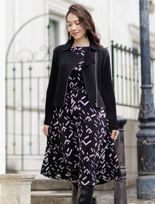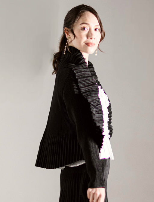 立体的で美しいドラマティックなフェイドアウトプリーツジャケット。 女らしさが香るショールカラーを大胆に彩るプリーツテクニックでシンプルなシルエットでもクチュール感ただよう1着に。 光と影が織り成す繊細な陰影と立体感を湛えたプリーツの表情が素敵です。