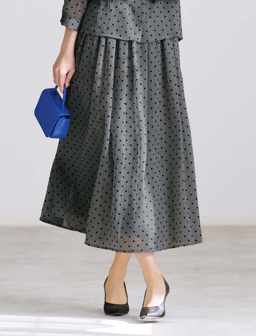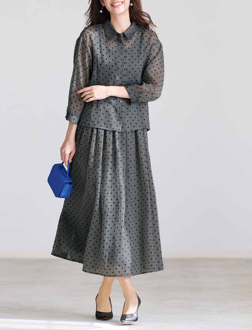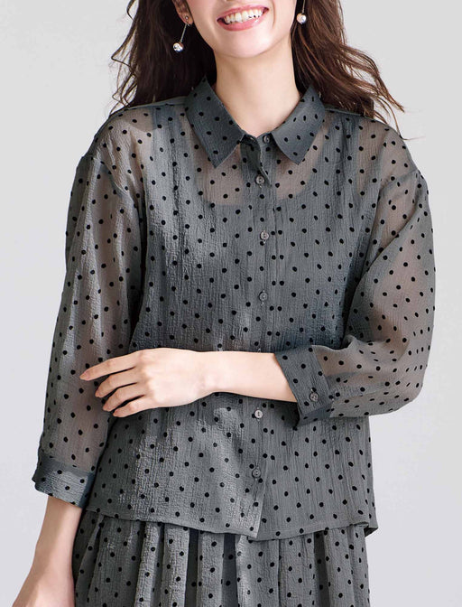 心ときめく「華」のある服。 ほのかな透け感とシボ感のある生地に、フロッキープリントのドット柄が可愛らしい雰囲気。 お揃いのシアースカートと合わせれば、より上品に、より都会的に旬のコーディネートが完成。