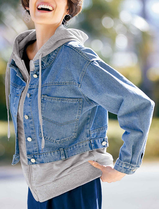 "重ね着の手間をゼロに” Gジャンとパーカーをドッキングした、ハイブリッドな一着。 ヴィンテージライクな本格デニムと、肌触りの良いスウェット素材が織りなす、大人のカジュアルスタイル。 春先や秋口の「何を着たらいいかわからない」時期に、これ一着で温度調節もスタイリングも決まります◎