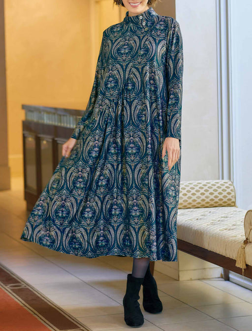 洗練された花柄が目を惹く主役級ワンピ。 程よい高さのハイネックとポケット付きのデザインが、機能性と美しさを両立。 暖かみのある柔らかな質感で、秋冬のお出かけをエレガントに彩ります。