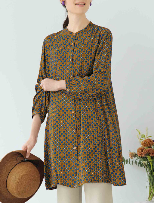 移ろう季節におしゃれを先取る、印象的なチュニック。 レトロで美しい小紋柄風プリントのチュニック。 歩くたびにエレガントに揺れるゆったりシルエットながら、きれいな落ち感で細見えす るのも魅力です。