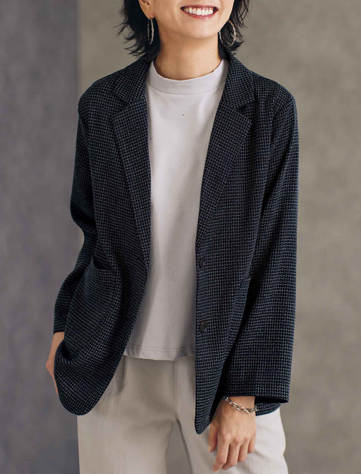 見た目より着心地の軽さと柔らかさに驚き! 三色の糸でつくる変わり織テーラードジャケット。 きちんと着映え力を発揮しながらもソフトな風合いで、軽やかに羽織れます。