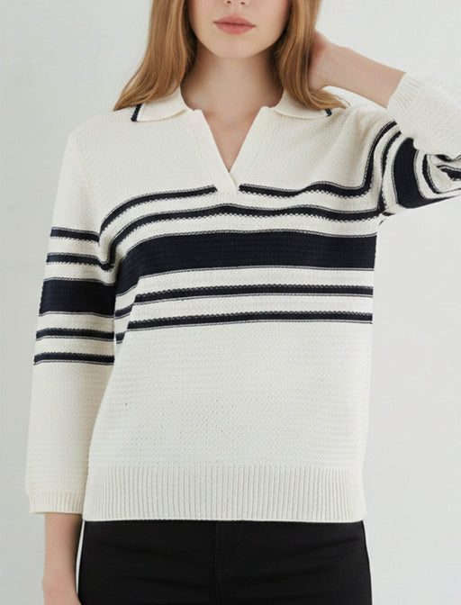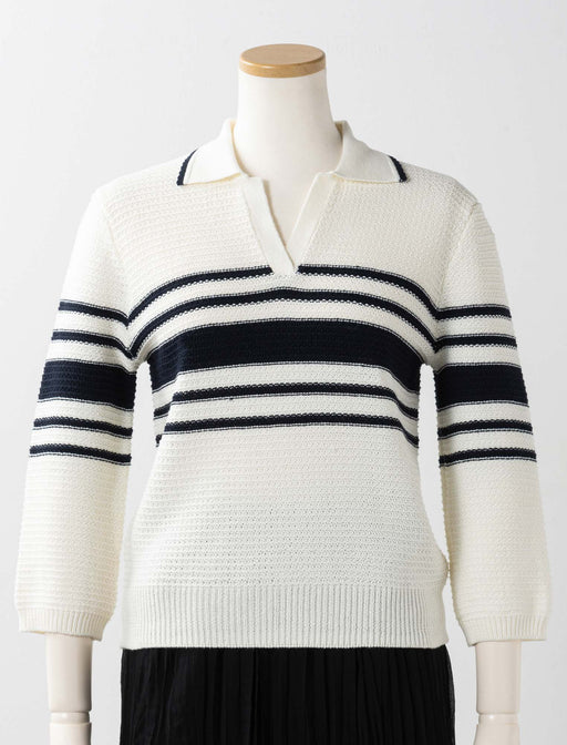 太さの異なるマルチボーダーが目を引く、清涼感あふれるスキッパーポロニット。 程よい厚みのワッフル編みがこなれ感を演出します。 襟付きのデザインで、カジュアルながらも大人の品格が漂う、着回し力抜群の一枚です。