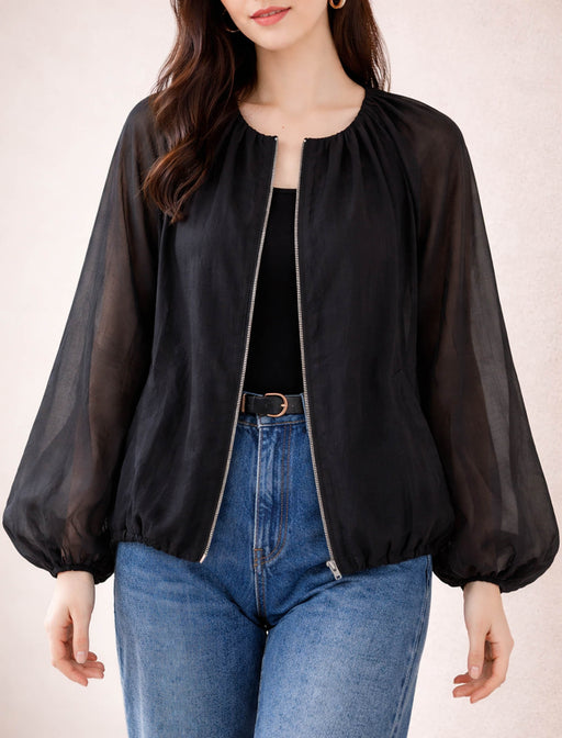 軽やかな透け感が旬な表情を作るシアーブルゾン。 首元と袖口のギャザーが作るふんわりとしたシルエットが、女性らしさを引き立てます。 冷房対策や季節の変わり目に重宝する、大人のカジュアルスタイルに最適な一着です。