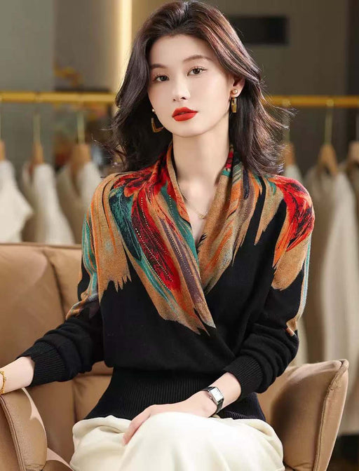 流れるような色彩が目を引く主役級の一枚。 深いVネックのカシュクールデザインがデコルテを美しく見せ、モードで華やかな印象を演出します。 柔らかな素材感で、大人のエレガンスを格上げする一着です。