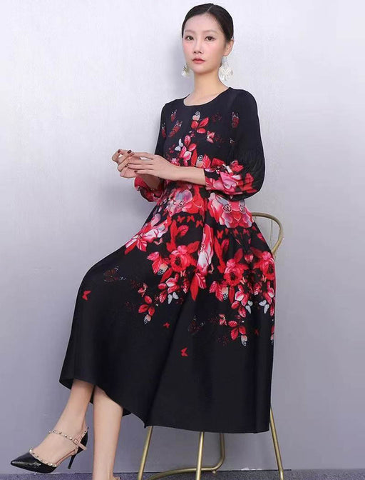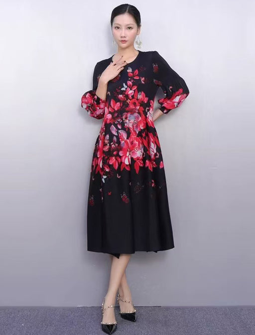 漆黒に鮮やかな赤の花々が咲き誇る、華やかな一枚。 たっぷりと生地を使ったフレアシルエットとボリューム袖が、歩くたびに優雅な余韻を残します。 特別な日を彩る、主役級のドレスワンピースです。