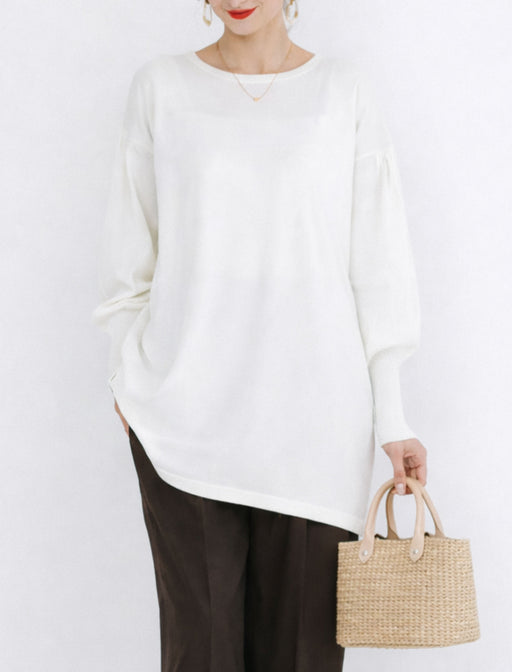 もちっとした柔らか触感で乾燥しがちなシーズンでも、優しく肌を包んでくれます。 ヒップが隠れるチュニック丈で着るだけで華奢見えラインが完成! デコルテが綺麗に見えるクルーネックで首元がスッキリとした印象に◎ タックの入ったボリュームのある袖が特徴的でシンプルさの中にも女性らしい雰囲気にしてくれます。