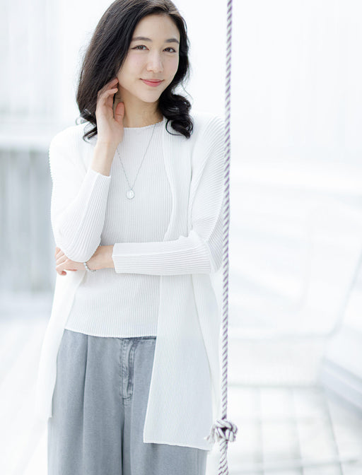 肌ざわりさらり、爽やかな着心地の綿混ニット。 肌が透けることで生まれる「抜け感」が、大人の女性にふさわしいセンシュアルな表情を引き出します。 合わせるボトムスを選ばず、オンオフ兼用で活躍します。