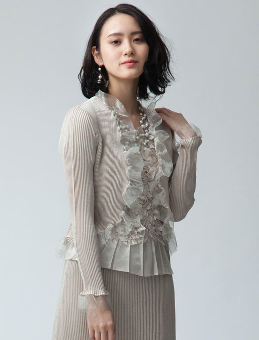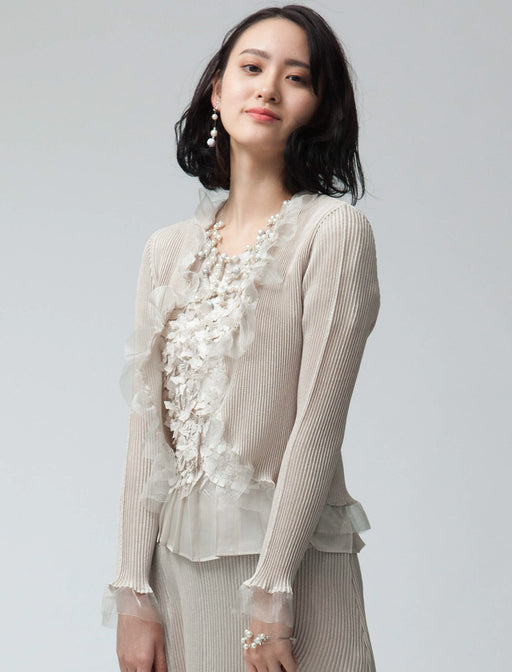 コンパクトな丈とオーガンジーの華やかなフリルトリミングが印象的なボレロジャケット。 シンプルなスタイルをエレガントに引き立たせるデザイン。 デイリーにはもちろん、オケージョンにも使いやすく、パーティやフォーマルシーンにもとても相性の良いステキな一枚です。