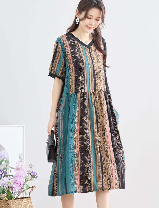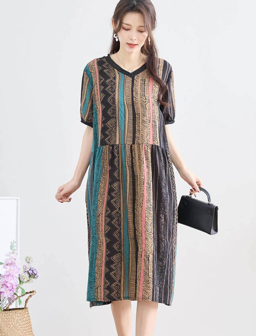 異国情緒漂うエスニック調のストライプ柄が印象的なVネックワンピース。 ゆったりとしたシルエットとギャザー切り替えが、女性らしいナチュラルな雰囲気を演出します。 動きのある縦ラインがスタイルアップ効果をプラスし、リラックス感のある着心地が魅力です。 カジュアルにもおしゃれ着にも活躍する万能アイテ...