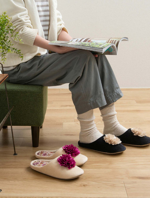 サテン生地の花モチーフを付けたインテリアスリッパ。 中板には小花柄がプリントされた生地を使用。 表生地にはふんわりと柔らかな綿ベロアのカラー生地を使い、にぎやかで楽しいデザインになっています。 派手すぎないニュアンスカラーが、いつものルームウェアに大人可愛いアクセントを添えてくれます。