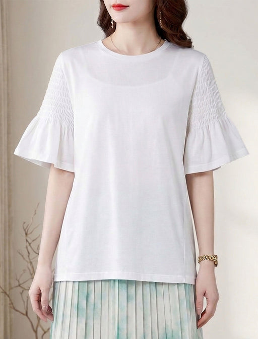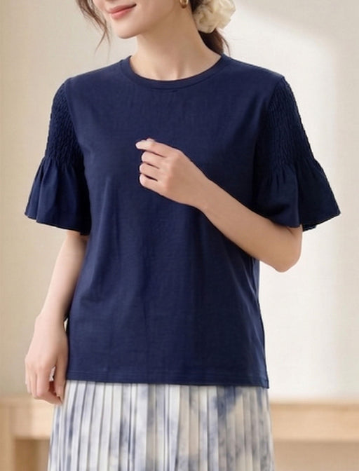 袖のシャーリングが二の腕をカバーし、上品な甘さを演出。 程よい光沢感のあるネイビーは、オンオフ問わず着回し力抜群。 体型を拾わないシルエットで、一枚でサマになる大人の万能トップスです。