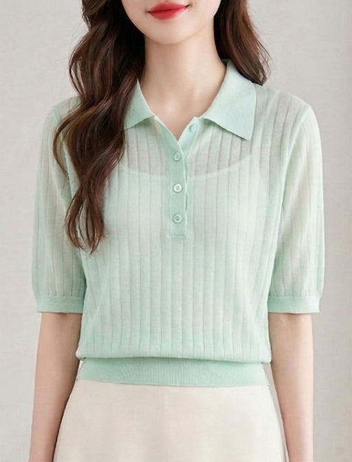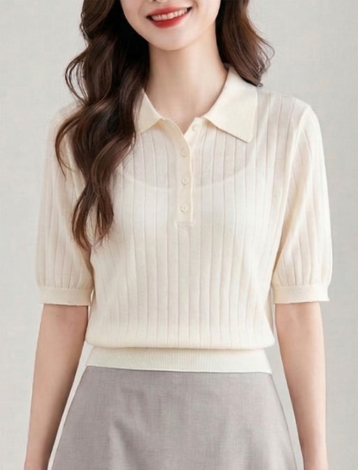 ほどよい透け感のリブ編みが、涼しげで上品な印象を与えるポロ襟ニット。 伸縮性のある細リブがボディラインを程よく拾いつつ、縦のラインを強調してスッキリとしたシルエットに。 パフスリーブとコンパクトな丈感はボトムスを選ばず、着るだけでこなれた大人のフェミニンスタイルが完成します。