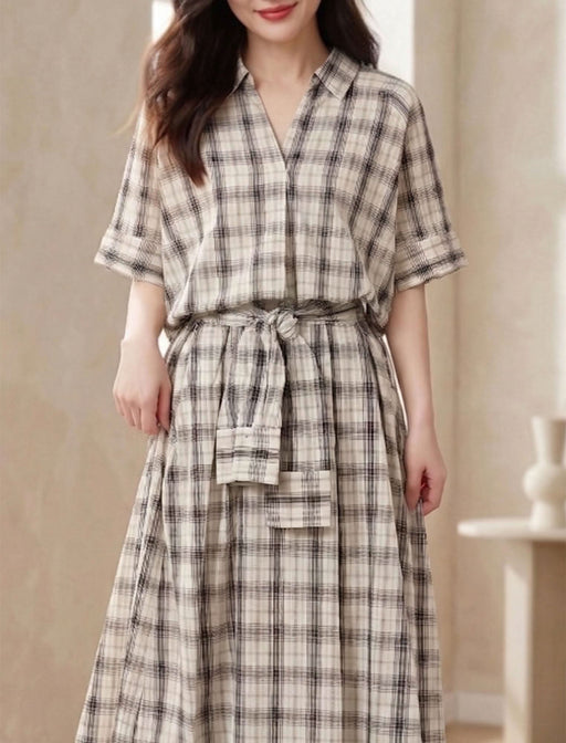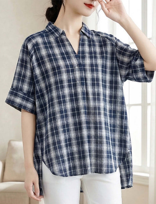 こなれた抜け感を演出するスキッパー襟のチェックシャツ。 背面のフレアデザインが、 360度どこから見ても華やかなシルエットを描きます。 ゆったりした身幅と前後差のある着丈で、体型カバーを叶えつつお洒落に決まる一着です。