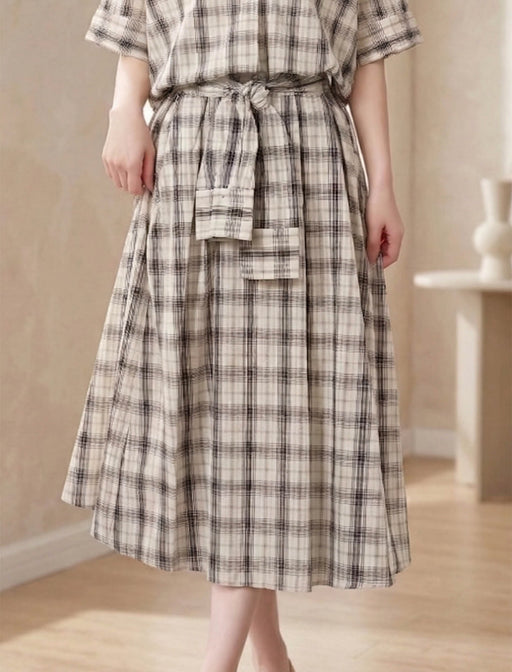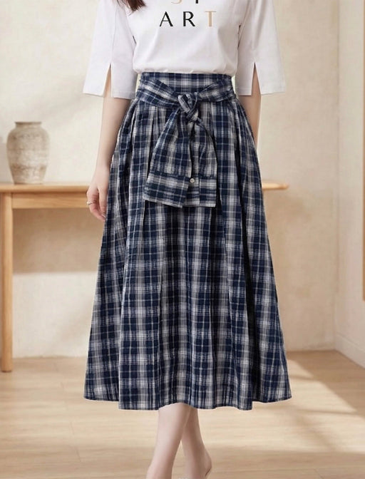 シャツを腰巻きしたような遊び心あふれるデザインが目を引くチェックスカート。 程よいボリュームのフレアシルエットが女性らしさを引き立てます。 シンプルなトップスと合わせるだけで、存在感のある着こなしに。