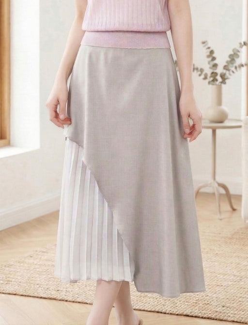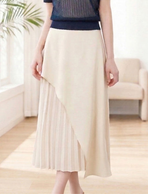 アシンメトリーなカッティングからプリーツが覗く、モードな表情のロングスカート。 動くたびに揺れる異素材のコントラストが、洗練された大人の気品を演出します。 一着でこなれ感の出る、主役級のアイテムです。