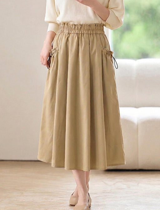 サイドのドロストポケットがアクセントを添える、ミリタリーテイストのロングスカート。 ふんわりとしたボリューム感とウエストのフリルが、女性らしさを引き立てます。 ゴム仕様で履き心地も快適な一着です。
