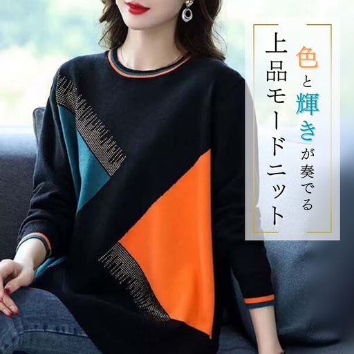 大胆な幾何学模様に、さりげなく光をまとったような “煌めきライン”。 しっかりとしたニットの質感と立体感ある配色デザインで、シンプルな着こなしも一気にスタイリッシュに。 日常の装いに「洗練された煌めき」をそっと添えて、あなたのスタイルを格上げする一着です。