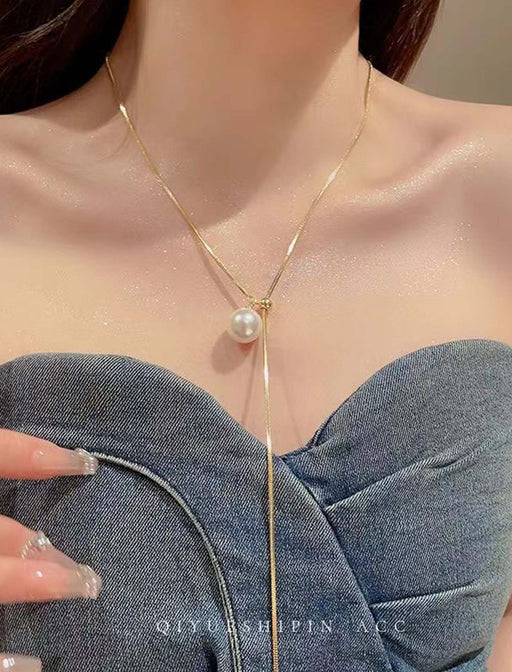 チョーカー風からロングスタイルまで自由に調整できるイミテーションパールネックレス。大きめの一粒イミテーションパールが華やかで、フォーマルシーンもカジュアルシーンもどちらもお使いいただけます。ハイネックやブラウスの上に合わせてコーデのポイントにしても◎。