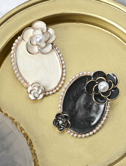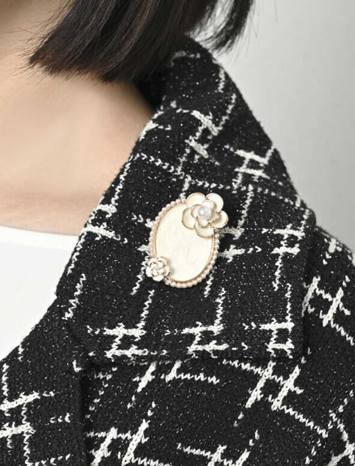 エレガントなカメリアモチーフに華やかなパールの優美さをプラス。 モノトーンの落ち着いたカラーにゴールドの縁取りで、クラシックかつ洗練された印象を演出。 トップスやストールにプラスするだけで、装いを上品に彩ります。