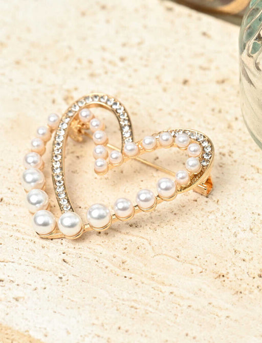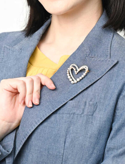繊細なゴールドのフレームに重なり合うハートモチーフが特徴的なブローチ。 ハートの縁にはラインストーンが散りばめられ、光を受けてキラキラと煌めきます。 ジャケットのラペルやストールなどにさりげなくプラスすれば、コーディネートの格上げに。