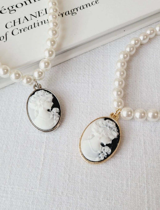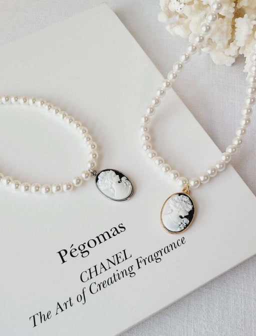 クラシカルな華やぎ、パール&カメオネックレス。 パールの上品な輝きとカメオの落ち着いたデザインが、大人の華やかさを演出します。 ほどよい長さでデコルテを美しく見せ、シンプルな装いにもアクセントとして映える一品。