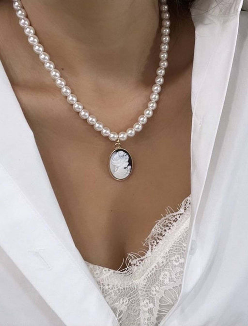 クラシカルな華やぎ、パール&カメオネックレス。 パールの上品な輝きとカメオの落ち着いたデザインが、大人の華やかさを演出します。 ほどよい長さでデコルテを美しく見せ、シンプルな装いにもアクセントとして映える一品。