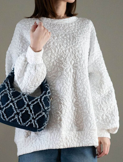 立体的なエンボス加工のフラワー柄が、着るだけで気分を上げてくれる主役級トップス。 シンプルながらもデザイン性が高く、いつものボトムスに合わせるだけで華やかなスタイルが完成します。 おしりが隠れる丈感も、安心してオシャレを楽しめるポイント。