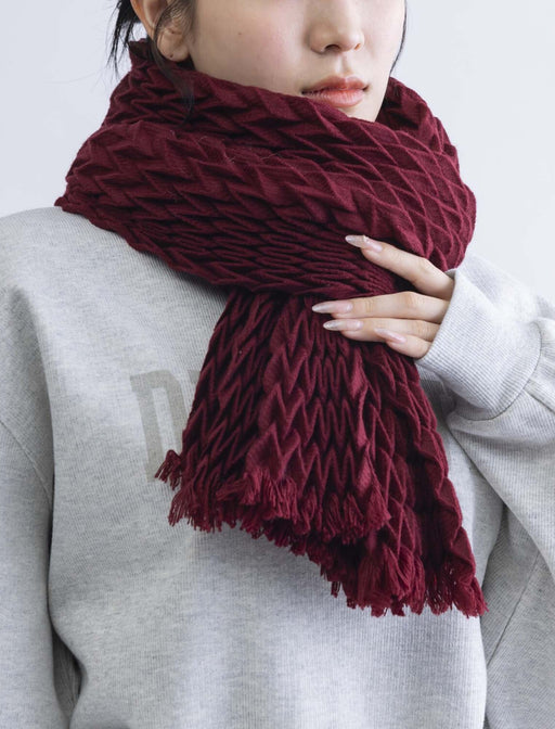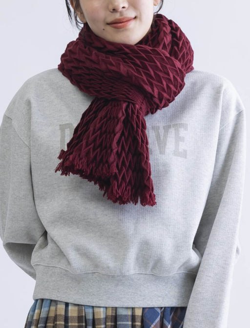 ぽこぽことした個性的なデザインの無地プリーツストール。 薄手の素材ですがプリーツでボリューム感をプラス、首元をふんわりと見せてくれます◎ 軽い素材感なので、厚着になりやすい冬場でもコーディネートのバランスをとってくれるオススメのアイテムです。