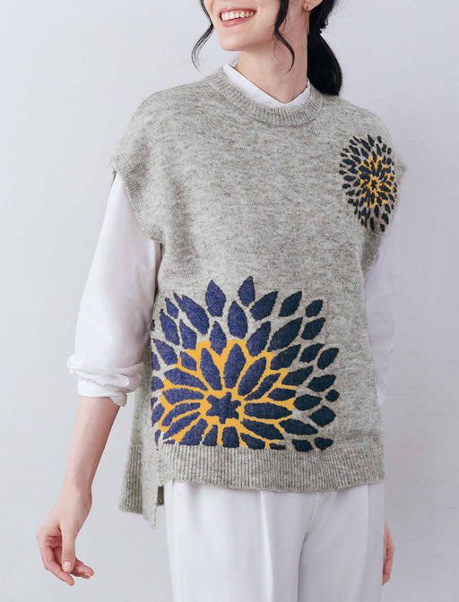装いに鮮やかな華を添える、 優しく柔らかなニットベスト。 シンプルなトップスに重ねるだけで、杢調の編み地のこなれ感とダリア柄の華やぎを両得。 肌触りの柔らかなニットベストは、パンツにもスカートにも好相性。 一瞬で装いが明るい印象に。