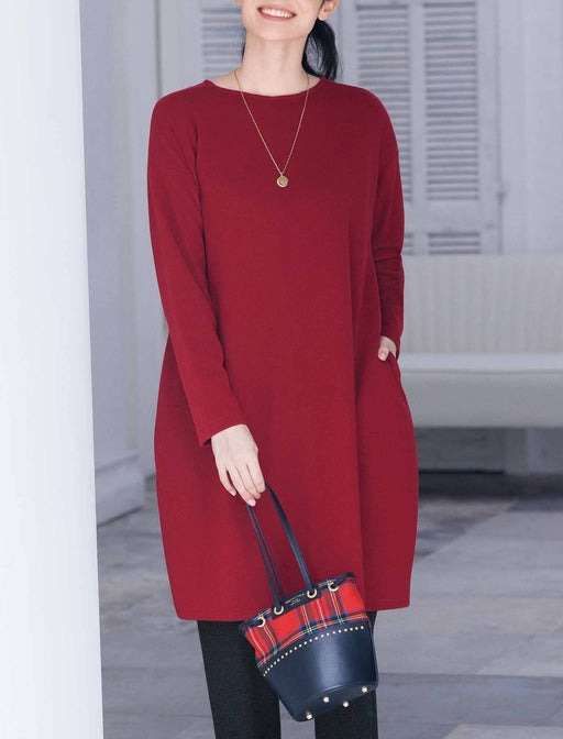 シンプルに着こなせて、パッと美映える深い赤。 シンプルながらおしゃれ見えするのは長めの丈感と印象的なカラーゆえ。 カットソーを微起毛させて顔映えする赤に深みを出しました。 ゆったり着られて腰やお腹をカバーできるのもうれしいポイント。