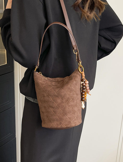 スエード調のやわらかな質感と、揺れるチャームが上品なアクセント。 肩掛け・手持ちどちらも楽しめる2way仕様で、コーディネートに合わせてバランスよく使い分けられます。 デイリーにもお出かけにも活躍する、大人のこなれバッグ。