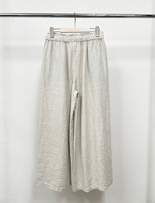 ナチュラルな風合いのリネン混素材が涼しげな印象のワイドパンツ。<br>ウエストは後ろ部分がゴム仕様で、すっきり見せつつラクな穿き心地。<br>シンプルなデザインで、カジュアルにもきれいめにも活躍します。