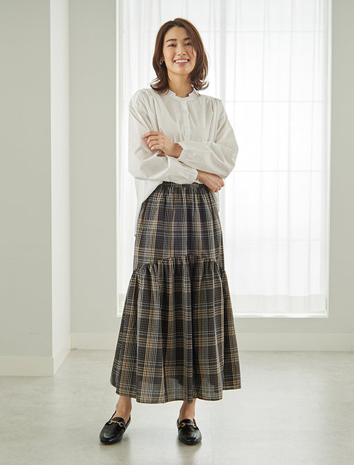 鮮やかなマドラスチェックが目を引く、1枚で主役級のティアードスカート。 程よいボリューム感と揺れ感が、動きに表情をプラス。 Tシャツやブラウスと合わせるだけで、華やかなスタイルが完成します。