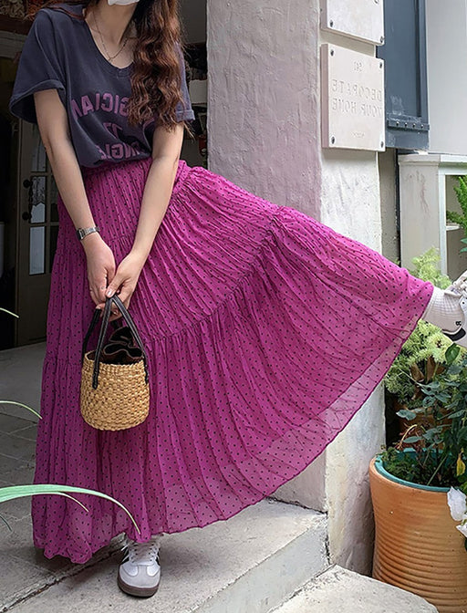 縦に流れるフリル襟が顔まわりを華やかに演出。<br>ほんのり透け感のあるシフォン生地で軽やかな印象。<br>ドット柄がシンプルでありながら上品さを引き立てます。